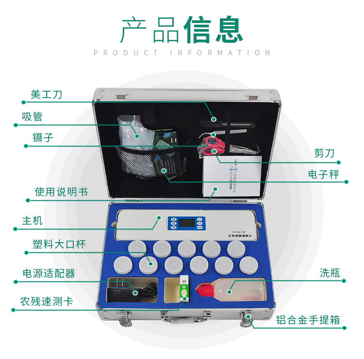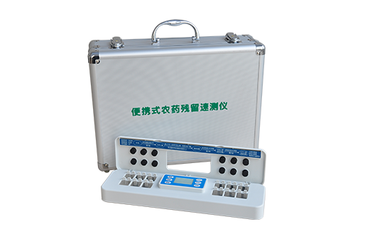 便携式农药残留检测箱仪器的检测原理是利用速测卡中的胆碱酯酶(白色药片)可催化靛酚乙酸酯(红色药片)水解为乙酸与靛酚,由于有机磷和氨基甲酸酯类农药对胆碱酯酶的活性有强烈的抑制作用,使催化水解后的显色发生改变。因此,根据显色的不同,即可判断样品中含有机磷或氨基甲酸酯类农药的残留情况