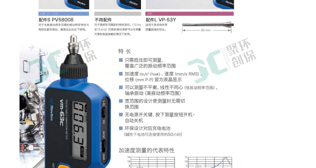 VM-63A测振仪重250克,主要用于机械设备的振动位移、速度(烈度)和加速度三参数的测量,利用该仪器在轴承座上测得的数据,对照国际标准ISO2372,或者利用企业、机器的标准,就可确定设备(风机、泵、压缩机、电机等)当前所处的状态(良好、注意或危险等)。