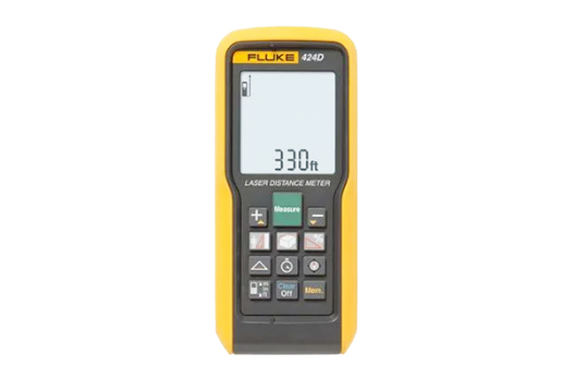 新型 Fluke 424D 多功能激光测距仪,可在更多的情况下为您节省更多的时间。其测距更长,达 100 米(330 英尺)。该测距仪配备了更大的 4 行显示屏、内置指南针和 180º 倾斜传感器,用于对准和高度追踪。