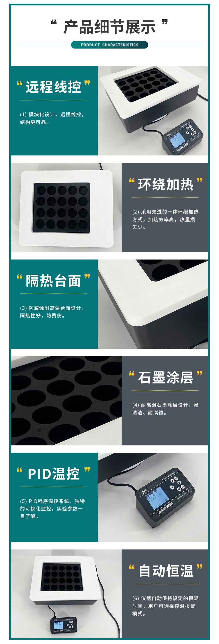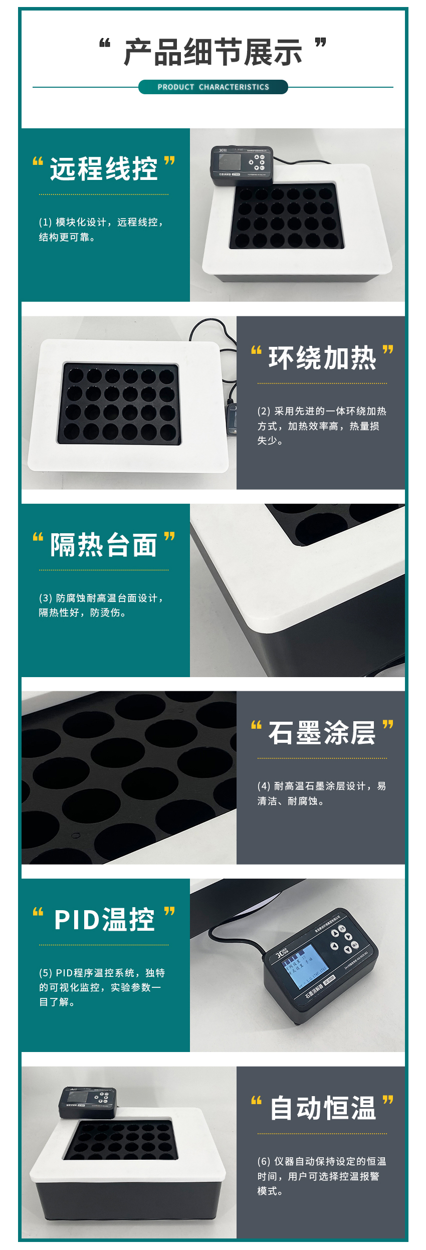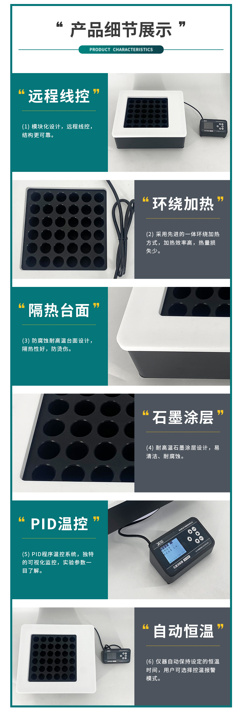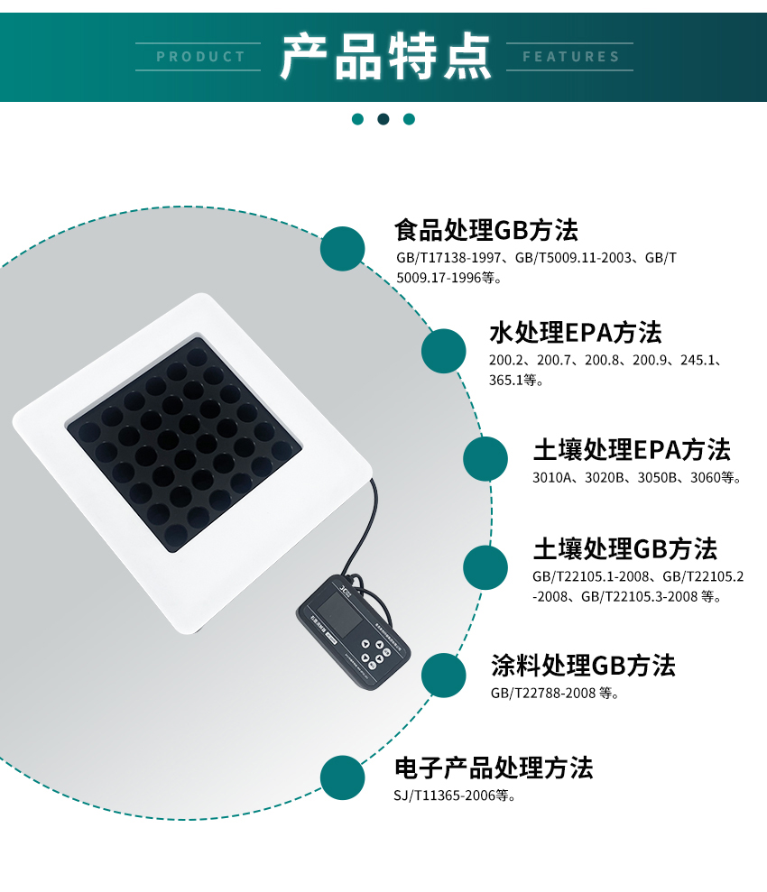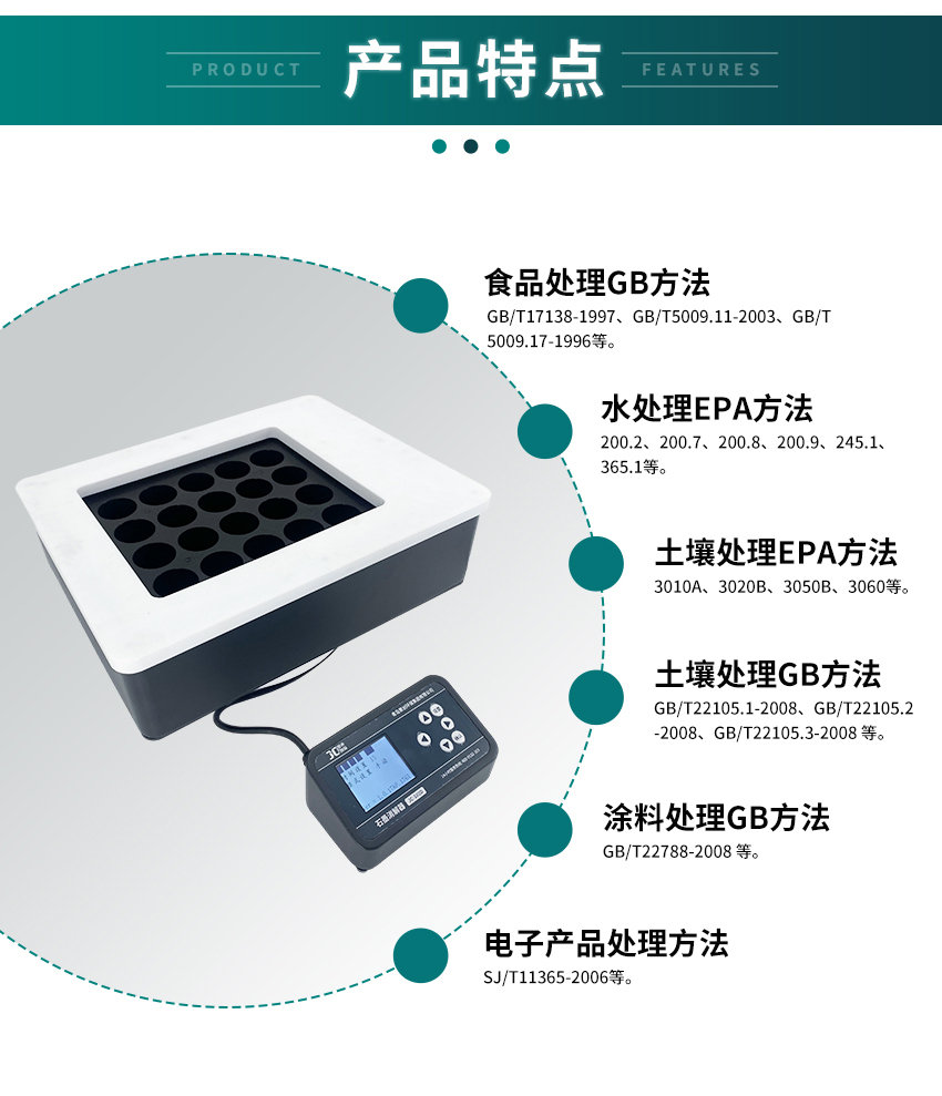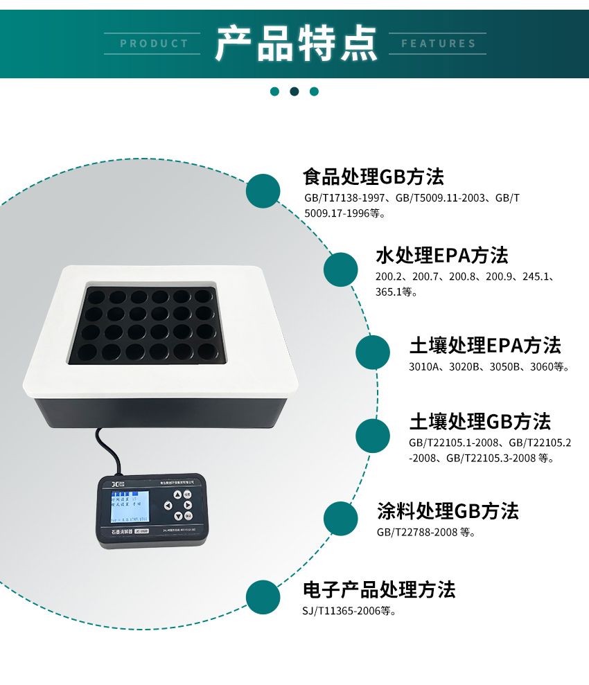 采用PID程序温控系统,独特的可视化监控,用户可通控制器界面清楚的看到整个消解过程中的各项参数-消解时间、保温时间、当前温度等。