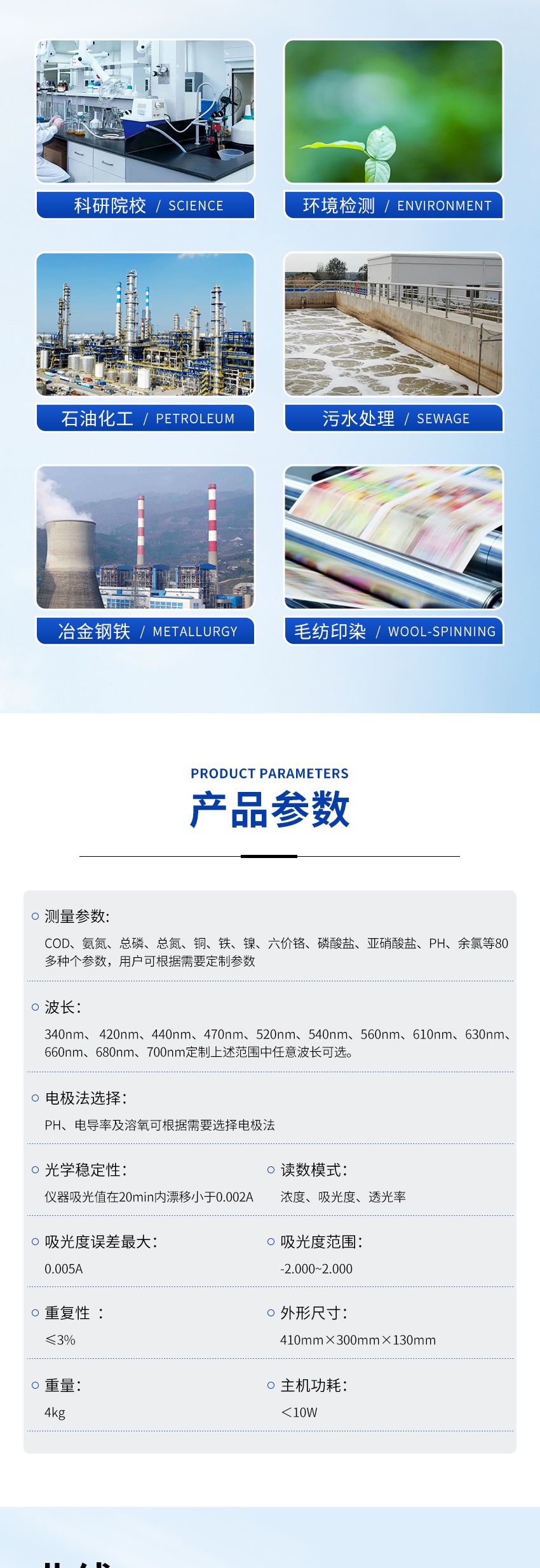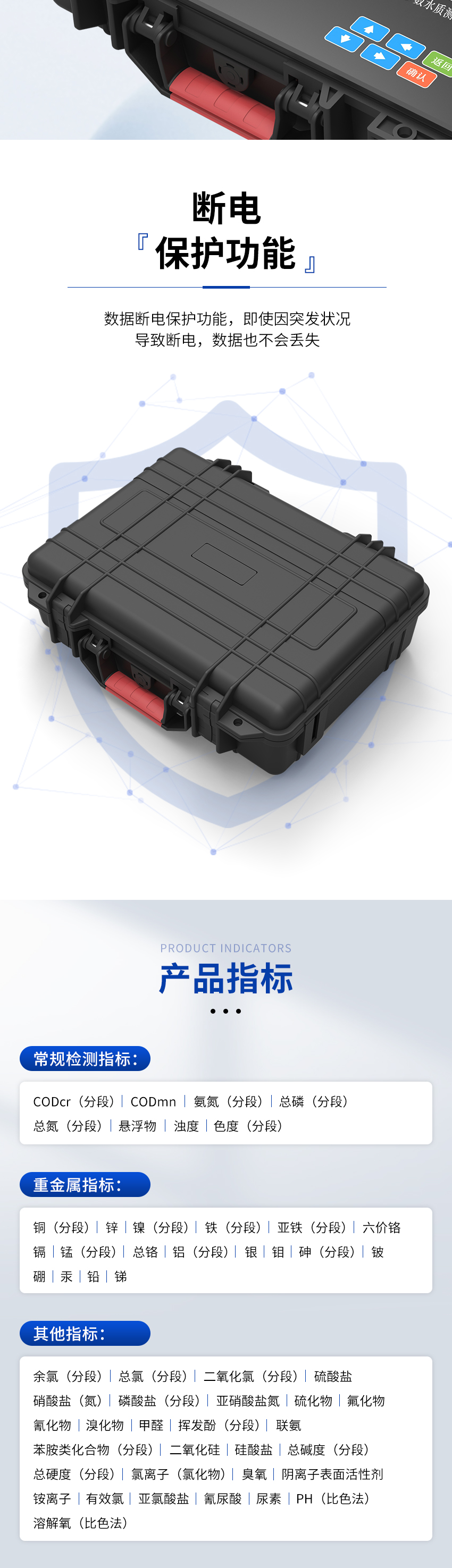 1、测量参数:COD、氨氮、总磷、总氮、铜、铁、镍、六价铬、磷酸盐、亚硝酸盐、PH、余氯等80多种个参数,用户可根据需要定制参数