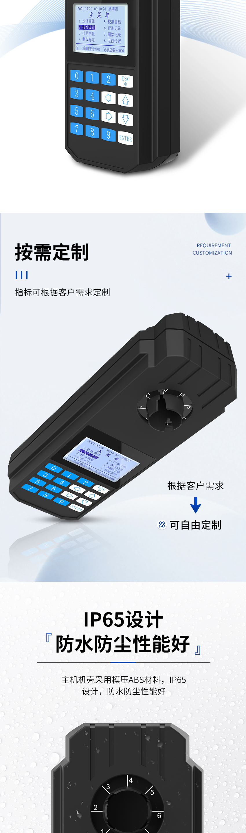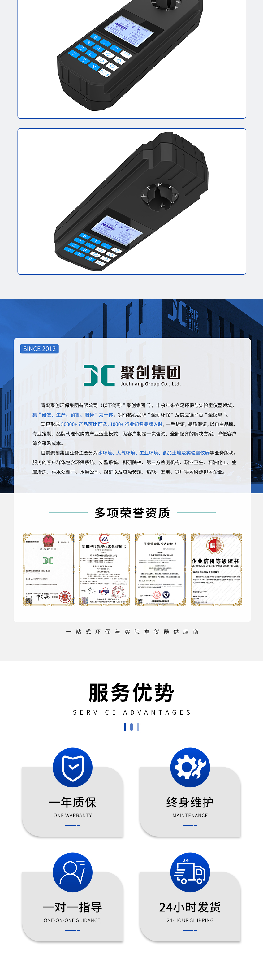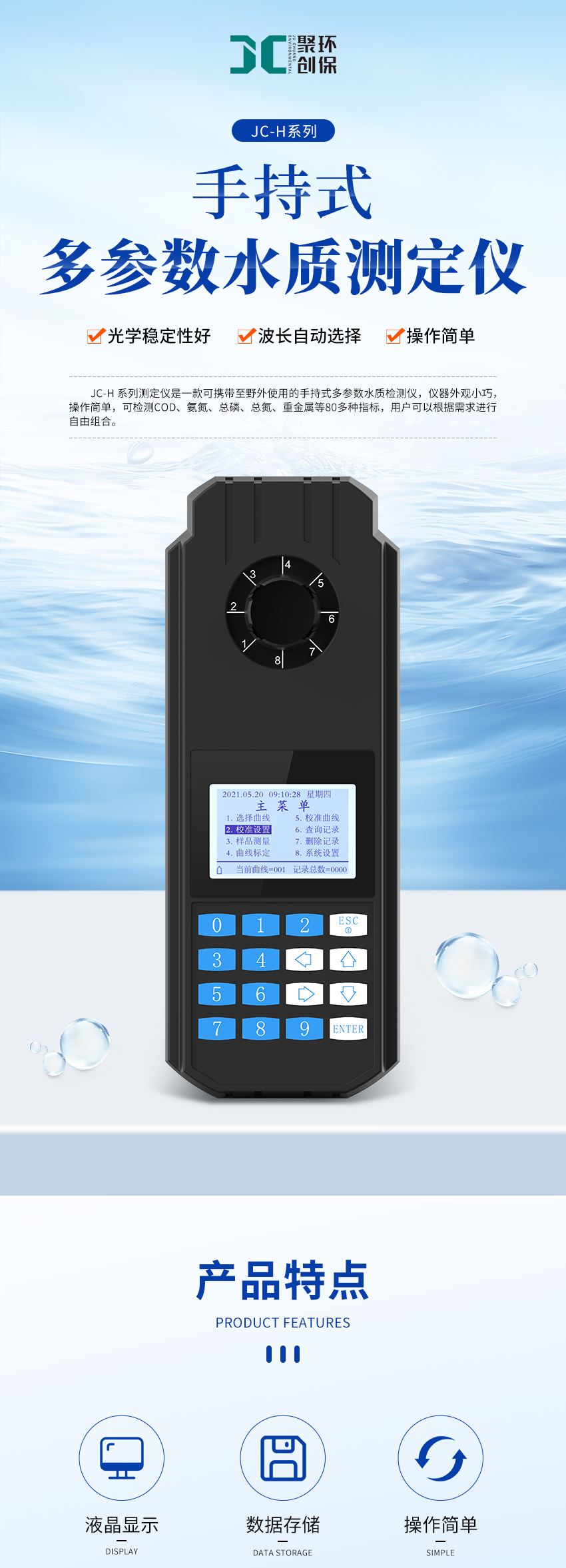 JC-H系列手持式多参数水质测定仪,用户可以根据需要进行自由的组合。广泛适用于饮用水、地表水、地面水及污水的测定。