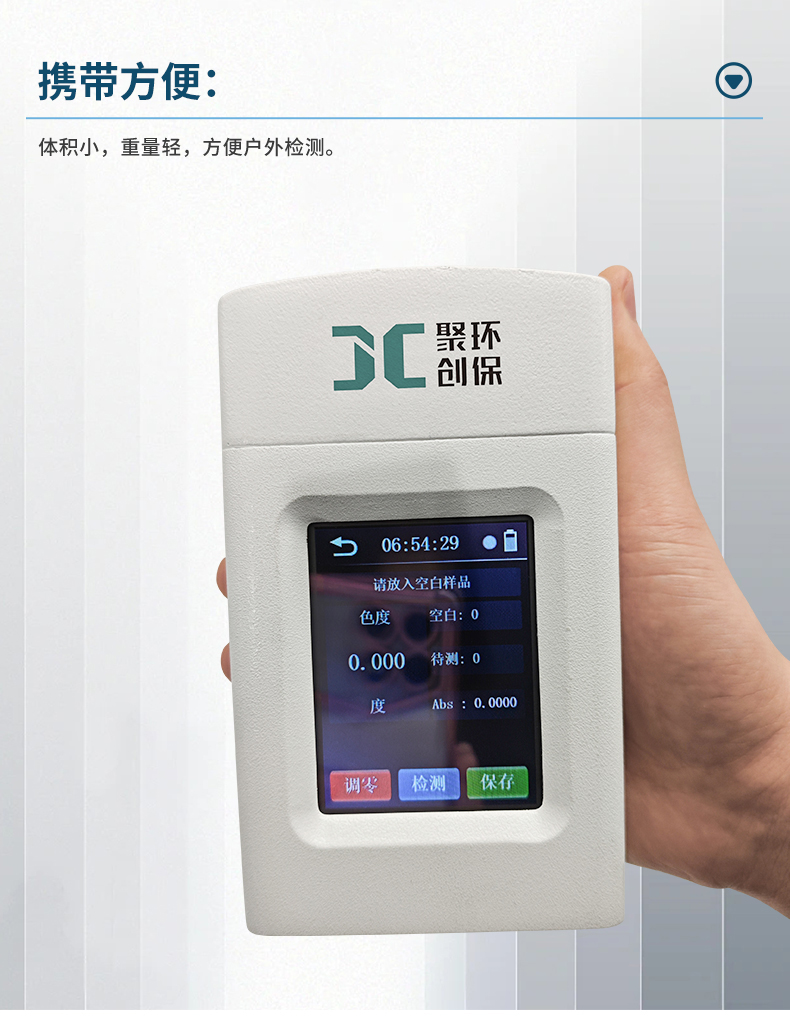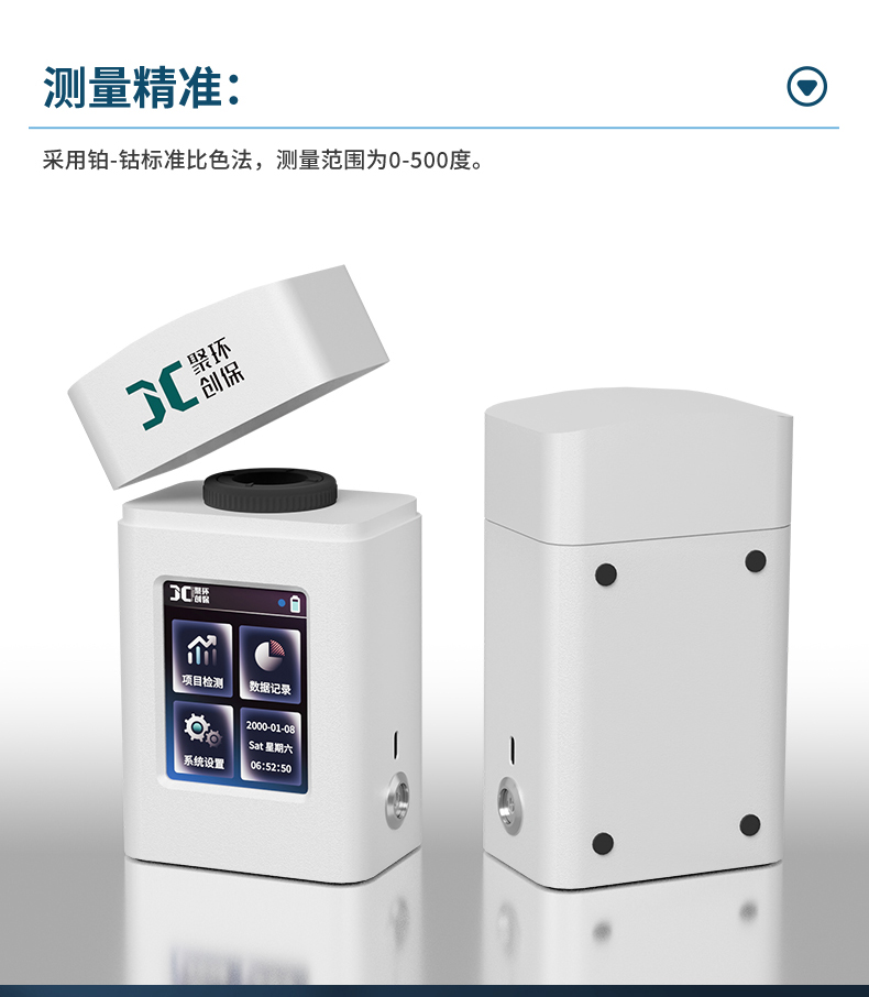 聚创JC-SD-100K型手持式色度测定仪利用铂—钴色度标准溶液进行标定,以“度”作为色度计量单位,具有体积小、重量轻、操作简便、灵敏度高等特点。可以广泛用于发电厂、纯净水厂、自来水厂、生活污水处理厂、饮料厂、环保部门、工业用水、制酒行业等部门的色度测定,从而达到规定的水质标准。