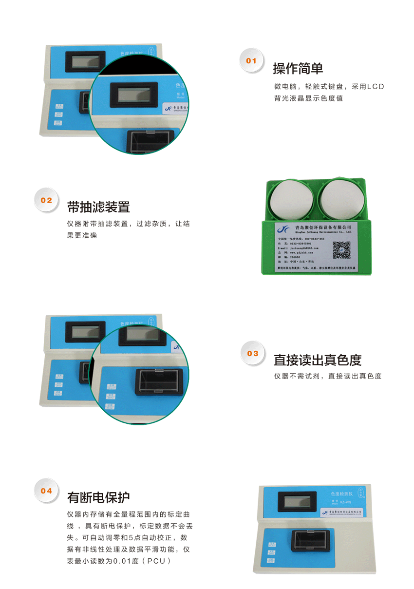 2、采用铂-钴色度标准液标定的光电比色仪,不需试剂,直接读出真色度。