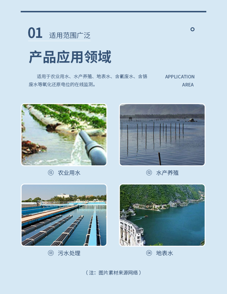适用于农业用水、水产养殖、地表水、含氰废水、含铬废水等氧化还原电位的在线监测。