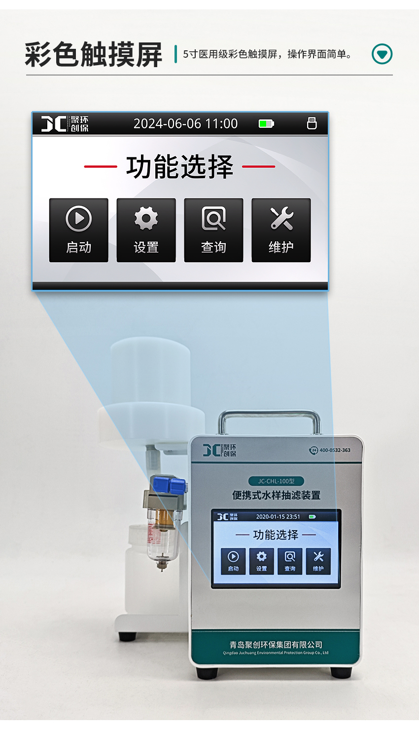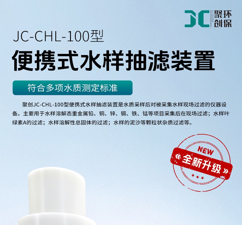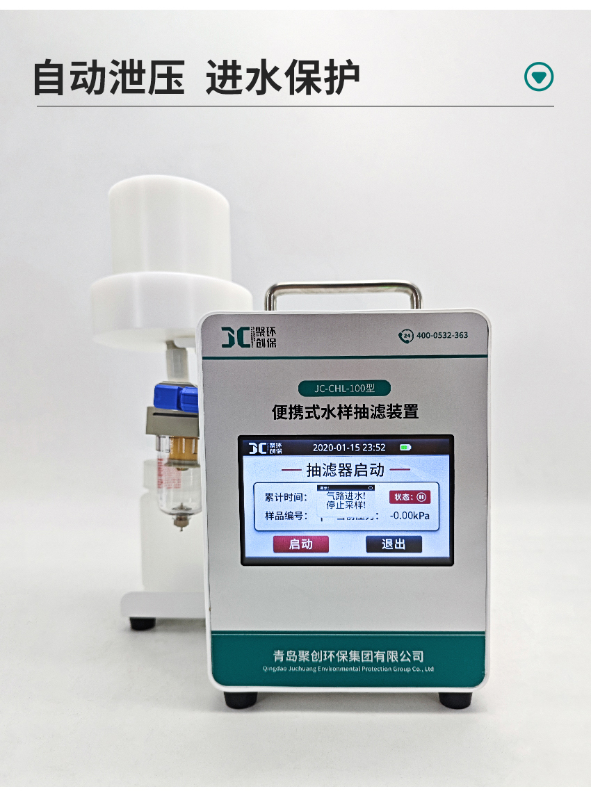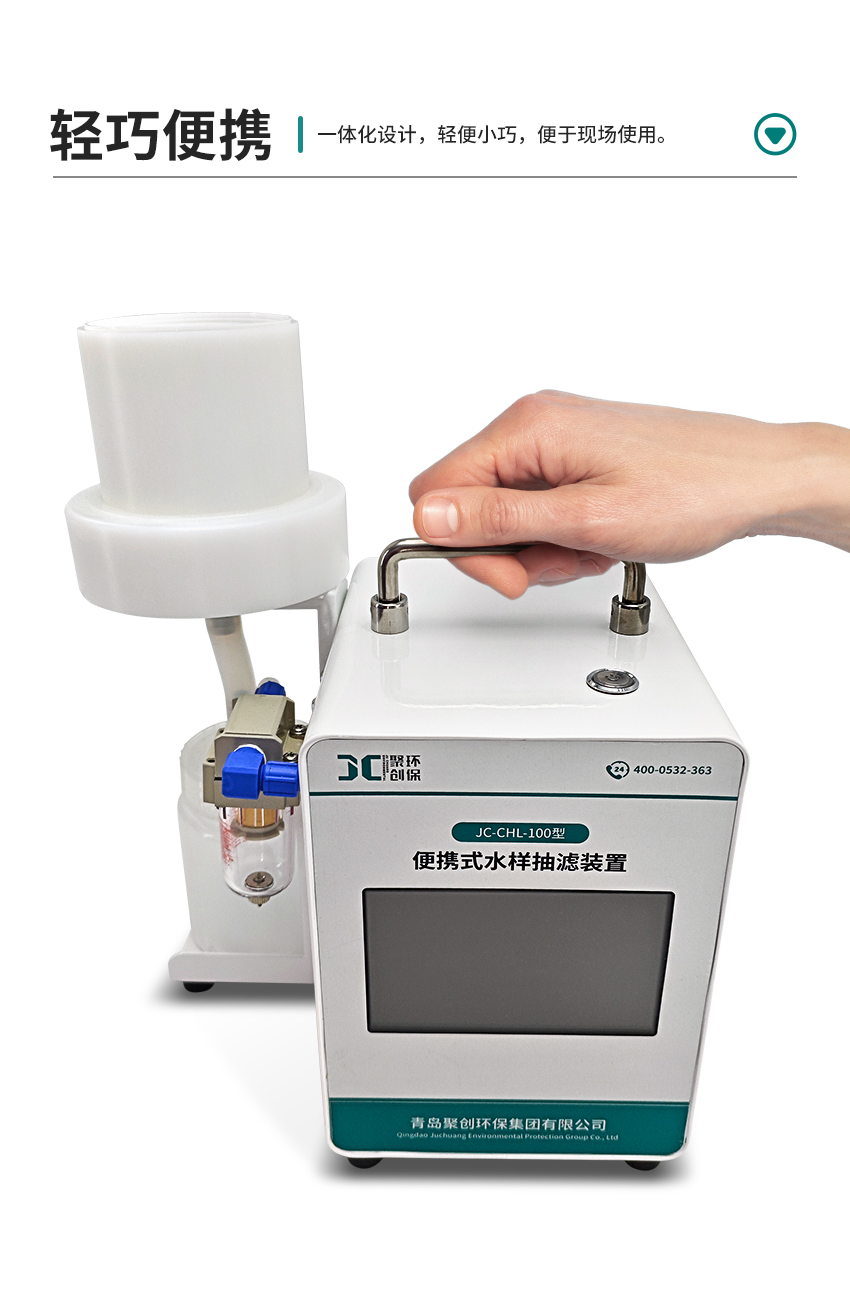 聚创JC-CHL-100型便携式水质抽滤装置是我公司为水质和土壤监测以及环境保护研制的便携式水质处理仪器,该仪器适用于测定可溶性元素时,对水样品进行现场过滤,提高水样的过滤速度和过滤效率。