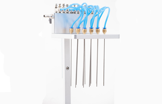 1、分配室上各气针通道可组合使用或单独使用,每一路气针均可单独开关。分配室的高度可视需要调节。