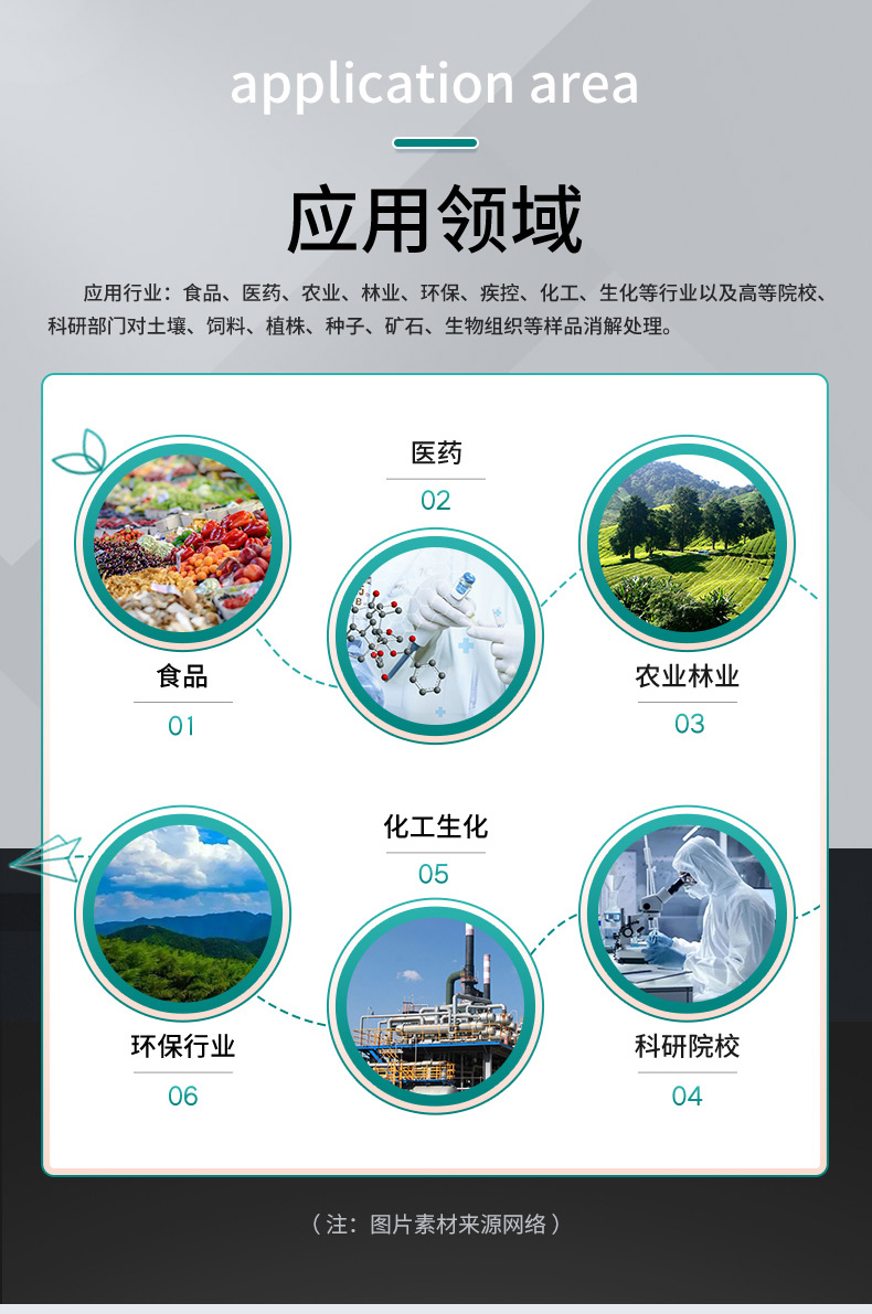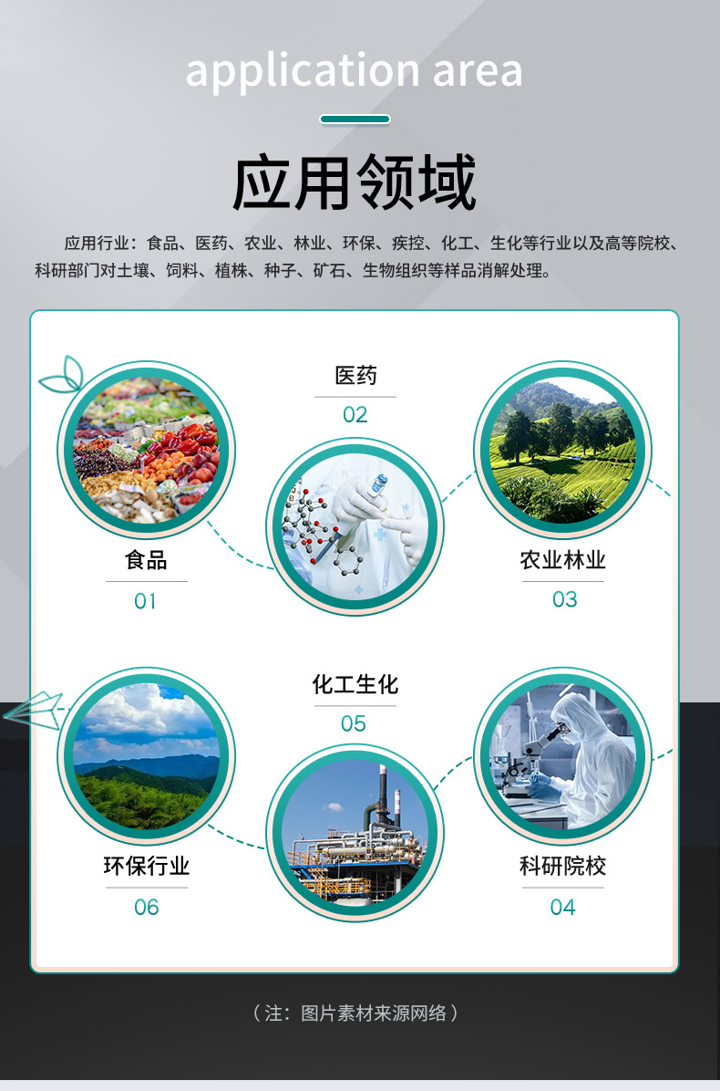 食品、医药、农业、林业、环保、疾控、化工、生化等行业以及高等院校、科研部门对土壤、饲料、植株、种子、矿石、生物组织等样品消解处理。