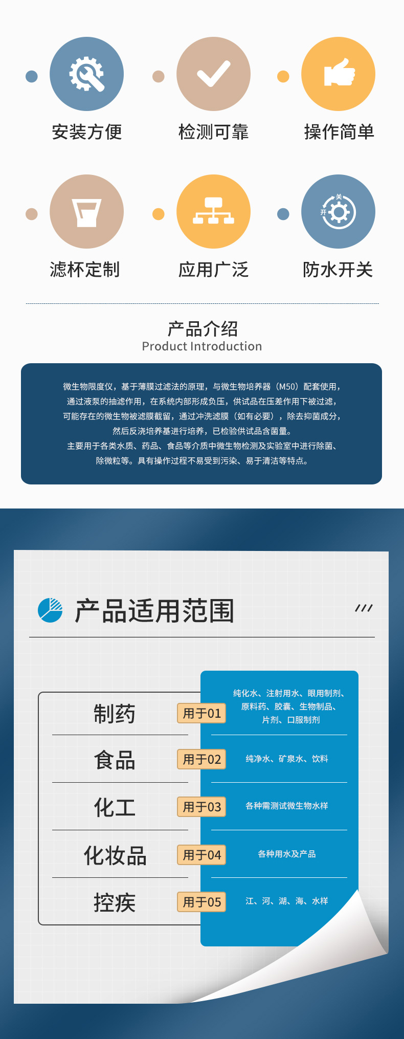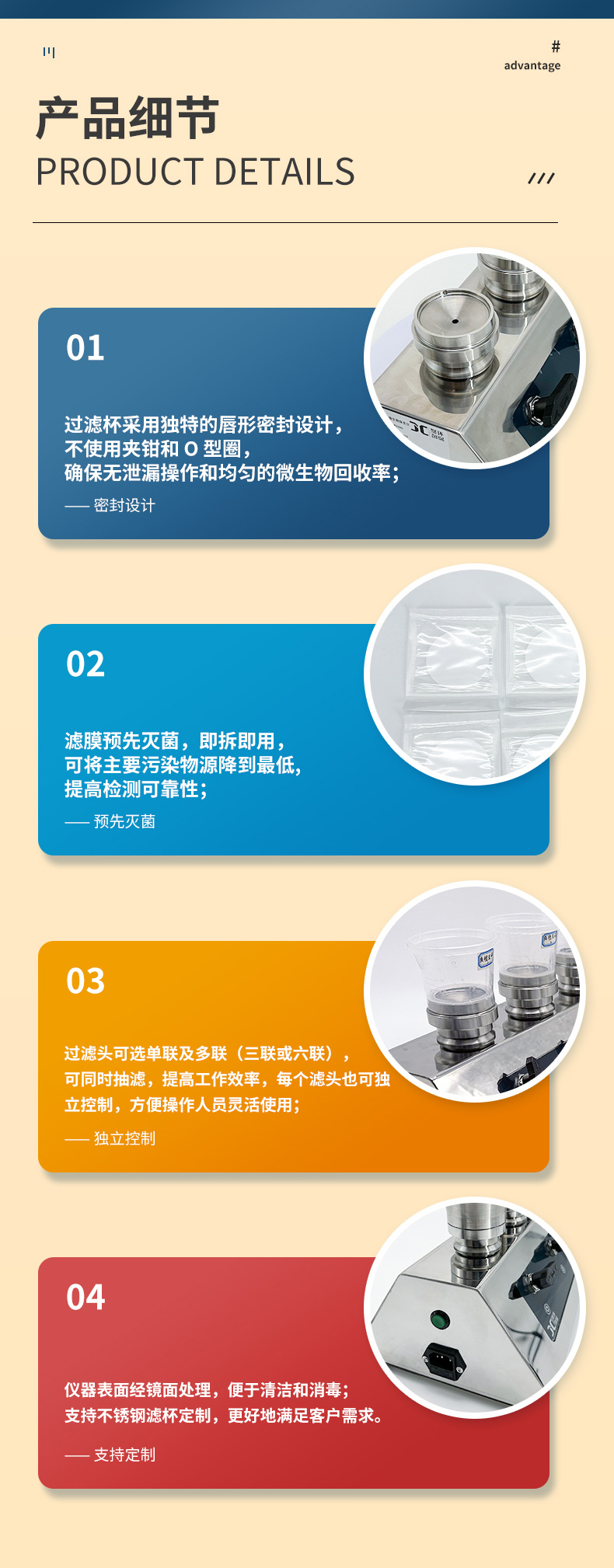 1、过滤杯采用特别的唇形密封设计,不使用夹钳和 O 型圈,确保无泄 漏操作和均匀的微生物回收率;