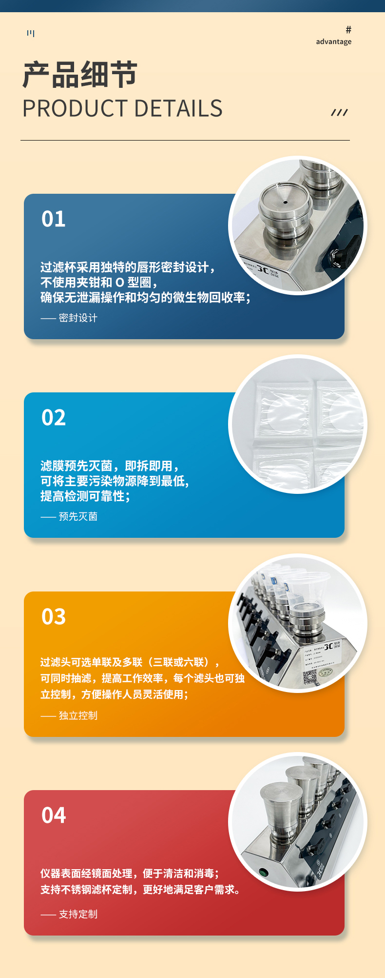 1、过滤杯采用特别的唇形密封设计,不使用夹钳和 O 型圈,确保无泄 漏操作和均匀的微生物回收率;