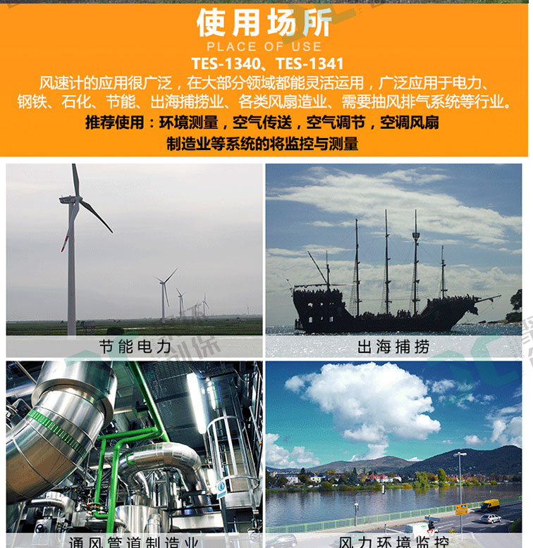 本表使用可伸缩型感应捧,其应用包含风口速度、洁净室、OSHA之依从,通风管及出风口、加热与空调、风洞、产品开发、空气流通研究及风管中之风量测量。
