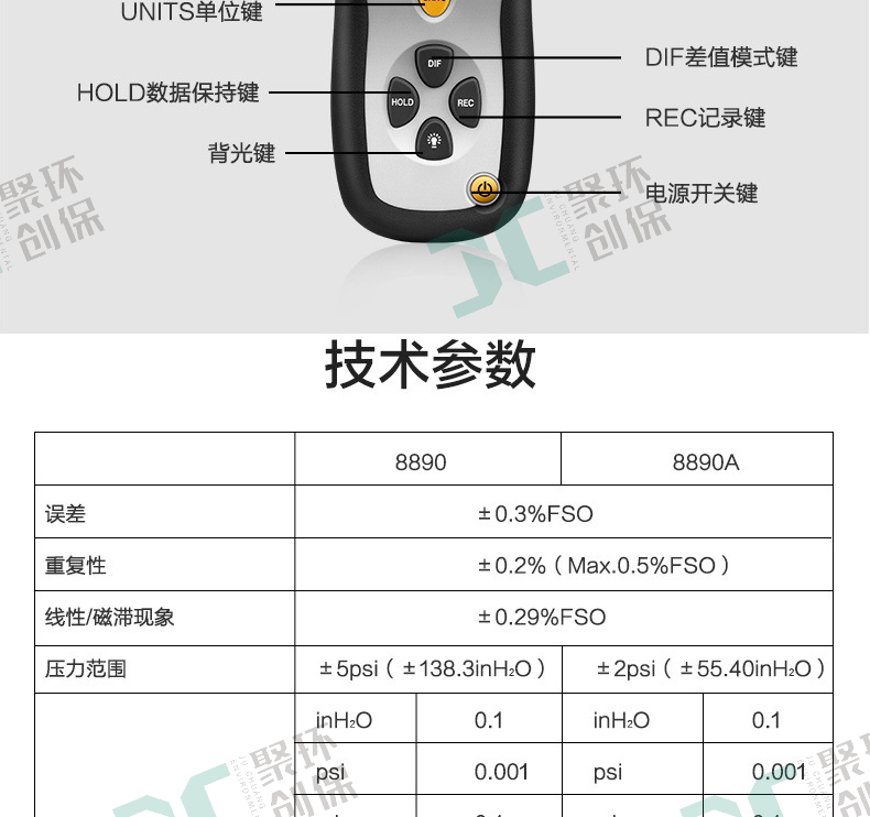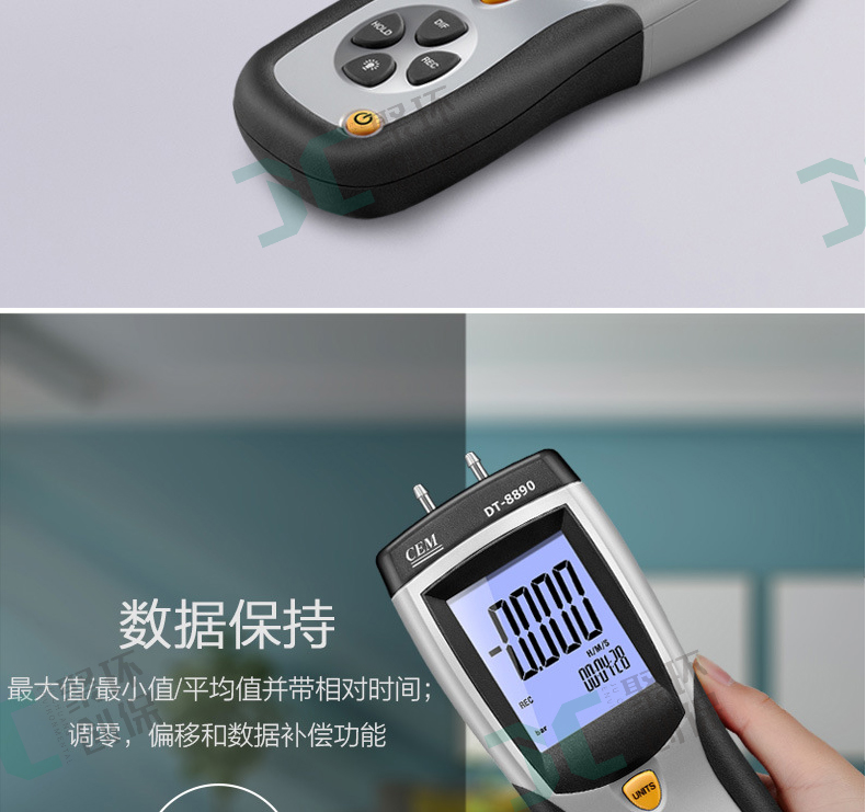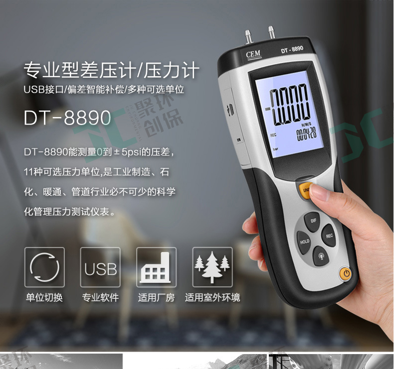 DT-8890/DT-8890A能测量0到±5psi的压差,11种可选压力单位:inH2O、psi、bar、mbar、kPa、inHg、 mmHg、ozin2、ftH2O、kgcm2。具有数据保持,*大值/*小值/平均值保持、调零、偏移和数据补偿。USB连接功能实现人机同步测量,以 及测量数据的保存和科学分析以便为每一项决策提供*佳数据化依据。是工业制造、石化、暖通、管道行业必不可少的科学化管理压力测试仪表。