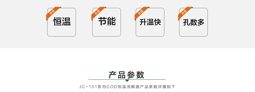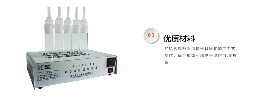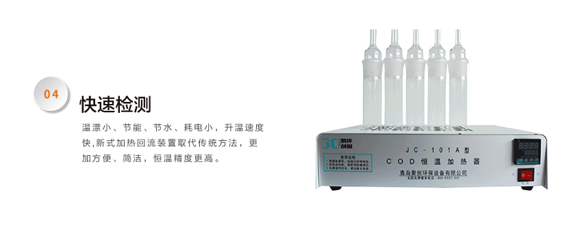 JC-101A型COD恒温加热器(COD消解仪)是经典方法分析污水中一种采用空气冷凝代替水冷凝测定化学耗氧量的加热回流装置,它采用新型温控器,升温速度快,温度恒定均匀,操作方便,是一种实验手段仪器化新产产品。