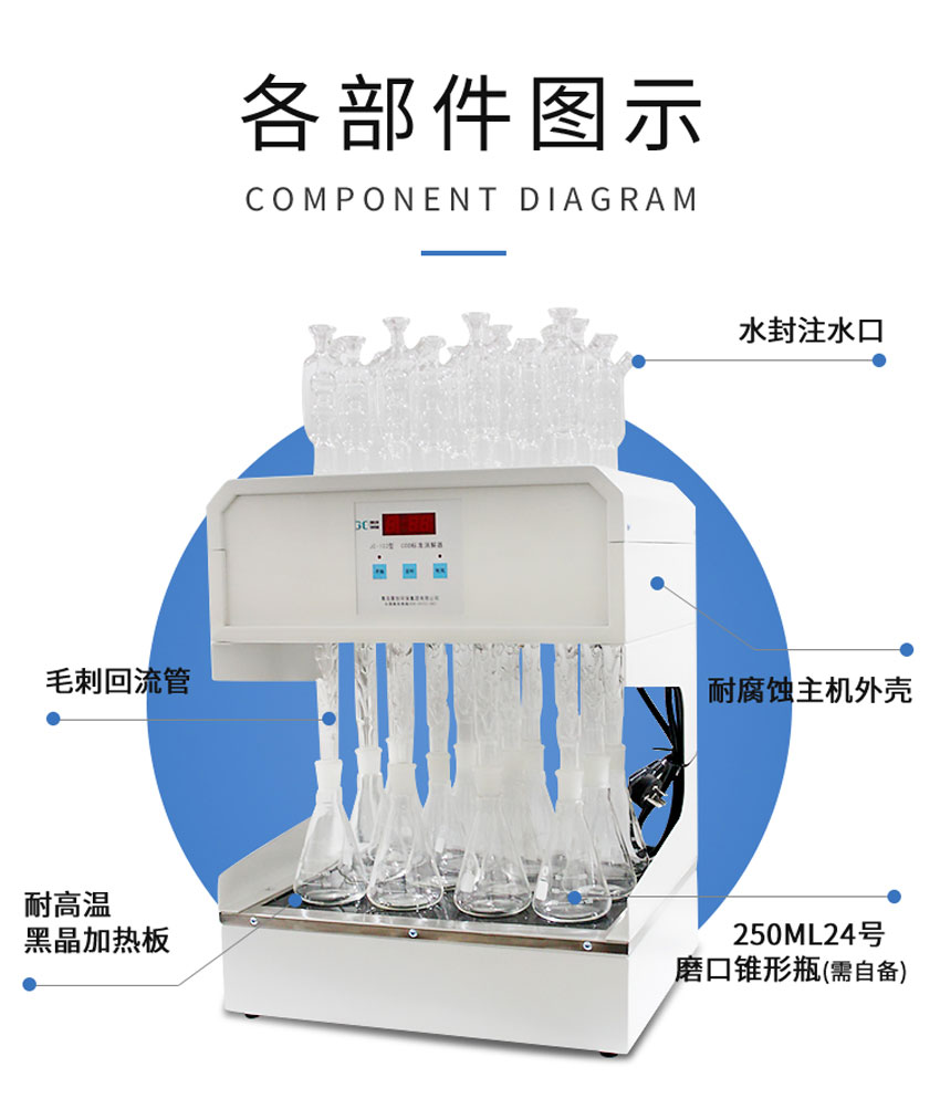 JC-102型标准COD消解器采用微机技术进行定时控制加热电炉,可对8个250ml锥形消解回流装置同时进行加热。达到节能、减低电力负荷、节水、提高 效率的目的。