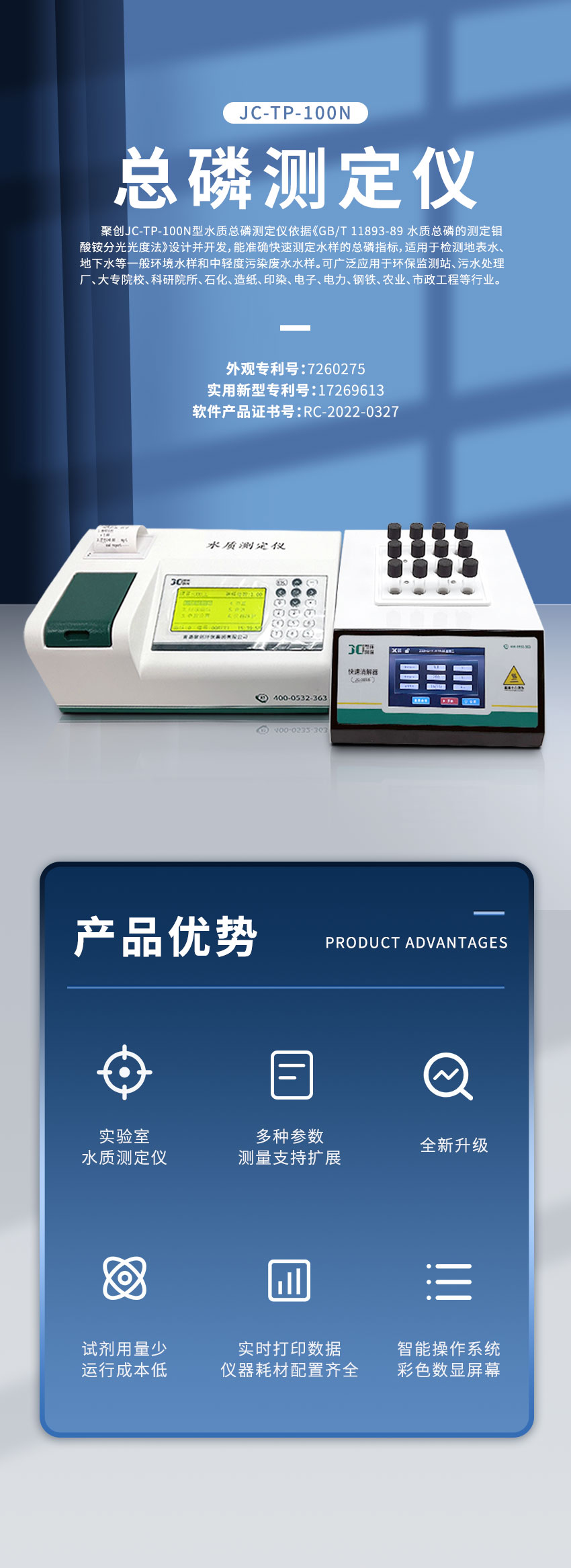 聚创JC-TP-100M型便携式总磷测定仪依据《GB/T 11893 水质 总磷的测定 钼酸铵分光光度法》设计并开发,能准确快速测定水样的总磷指标,适用于检测地表水、地下水等一般环境水样和中轻度污染废水水样。可广泛应用于环保监测站、污水处理厂、大专院校、科研院所、石化、造纸、印染、电子、电力、钢铁、农业、市政工程等行业。