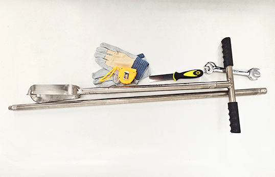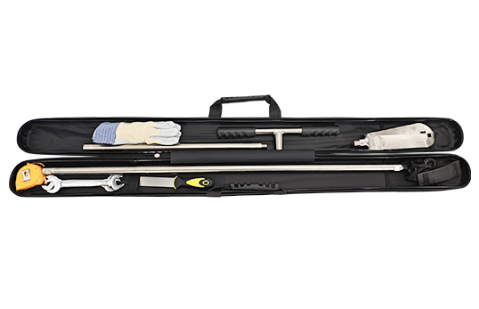1个心型钻头,1个T型手柄,1个1米延长杆,1个0.5米延长杆,1把刮刀,2个扳手,1个钢卷尺,1个便携包