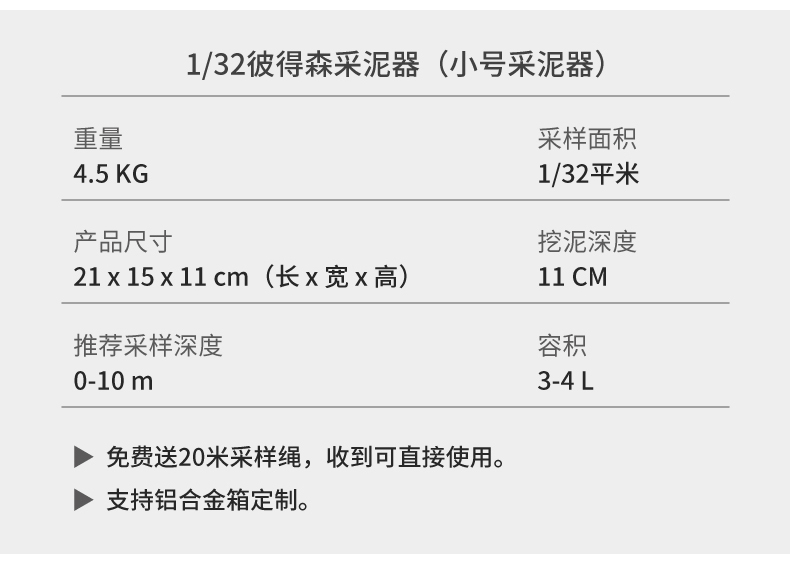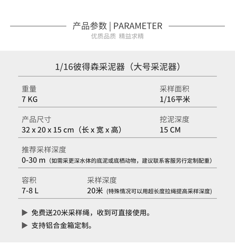 (5)推荐采样深度:0-30 m(如需采更深水体的底泥或底栖动物,建议联系客服另行定制配重)