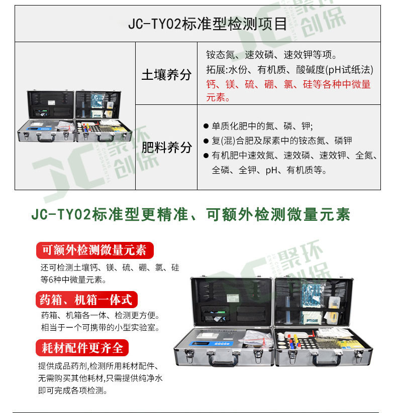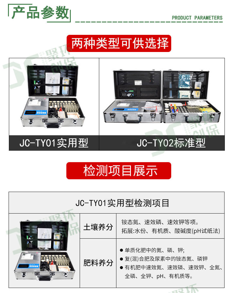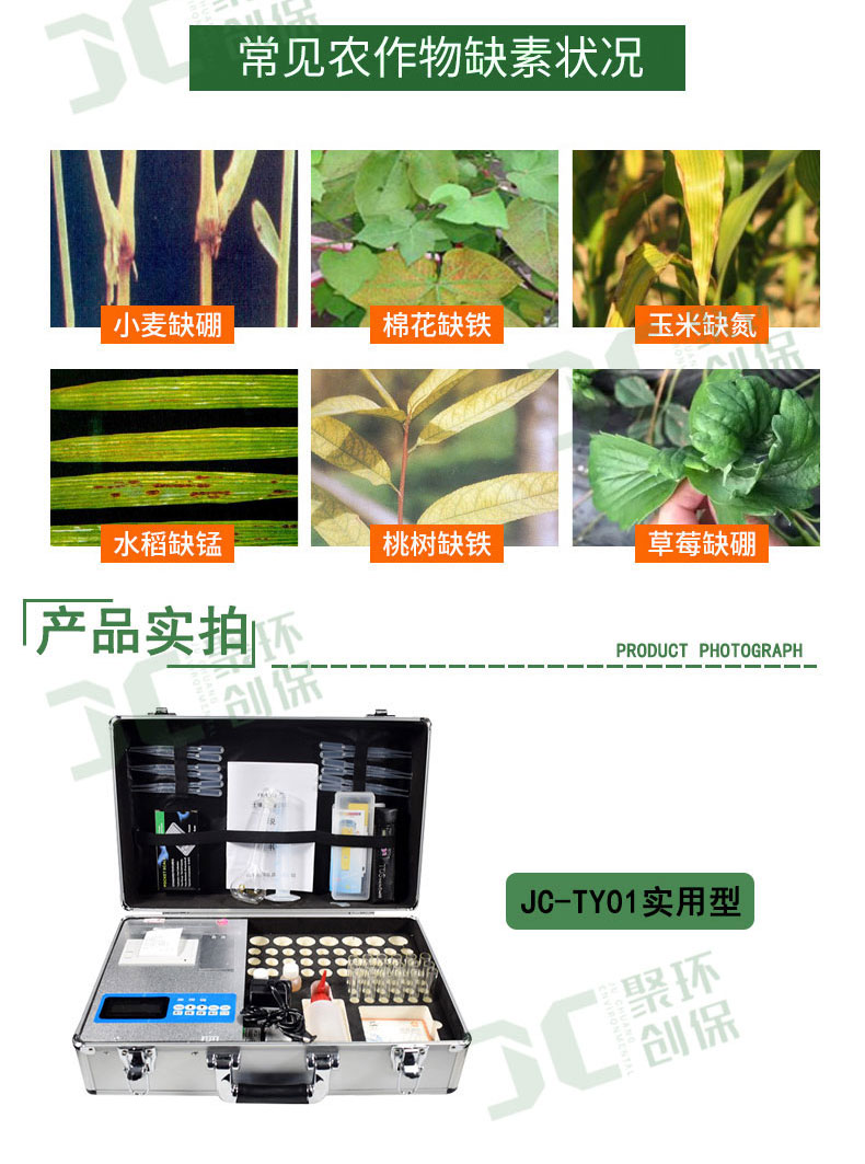 JC-TY01实用型土壤养分速测仪是我公司根据国家有关土壤检验的标准方法,结合快速检测方法研制出的一款土壤定量分析仪器 可广泛应用于检测以下项目: