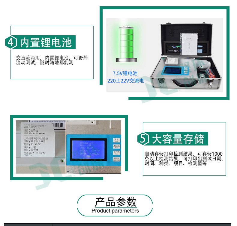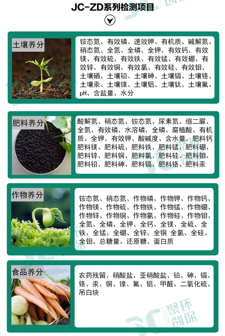 JC-ZD系列高智能多参数土壤肥料养分检测仪采用微电脑控制,程序化设计,5.1寸大屏幕中文汉字背光显示,交直流两用,内置锂电池,可野外流动测试。无需空白和标准校准,一键式操作,直接读取数据,配套成套附件及成品药剂。可检测土壤(33项)、肥料(31项)、作物(32项)、食品(15项)共111个测试项目。触摸式按键,汉字引导操作,内置热敏打印机,可打印测试结果。