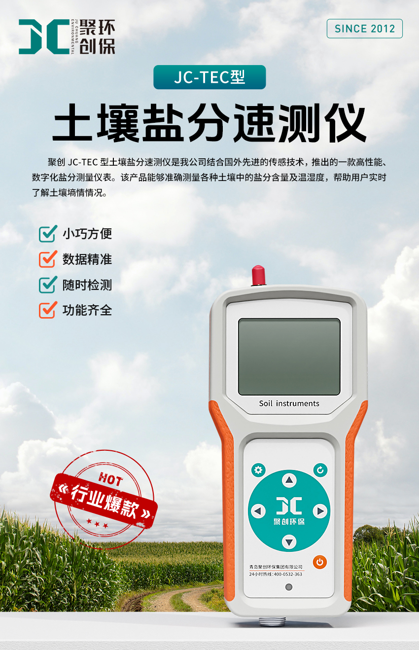 聚创JC-TEC型土壤盐分速测仪是我公司结合国外先进的传感技术,推出的一款高性能、数字化盐分测量仪表。该产品能够准确测量各种土壤中的盐分含量及温湿度,帮助用户实时了解土壤墒情情况。