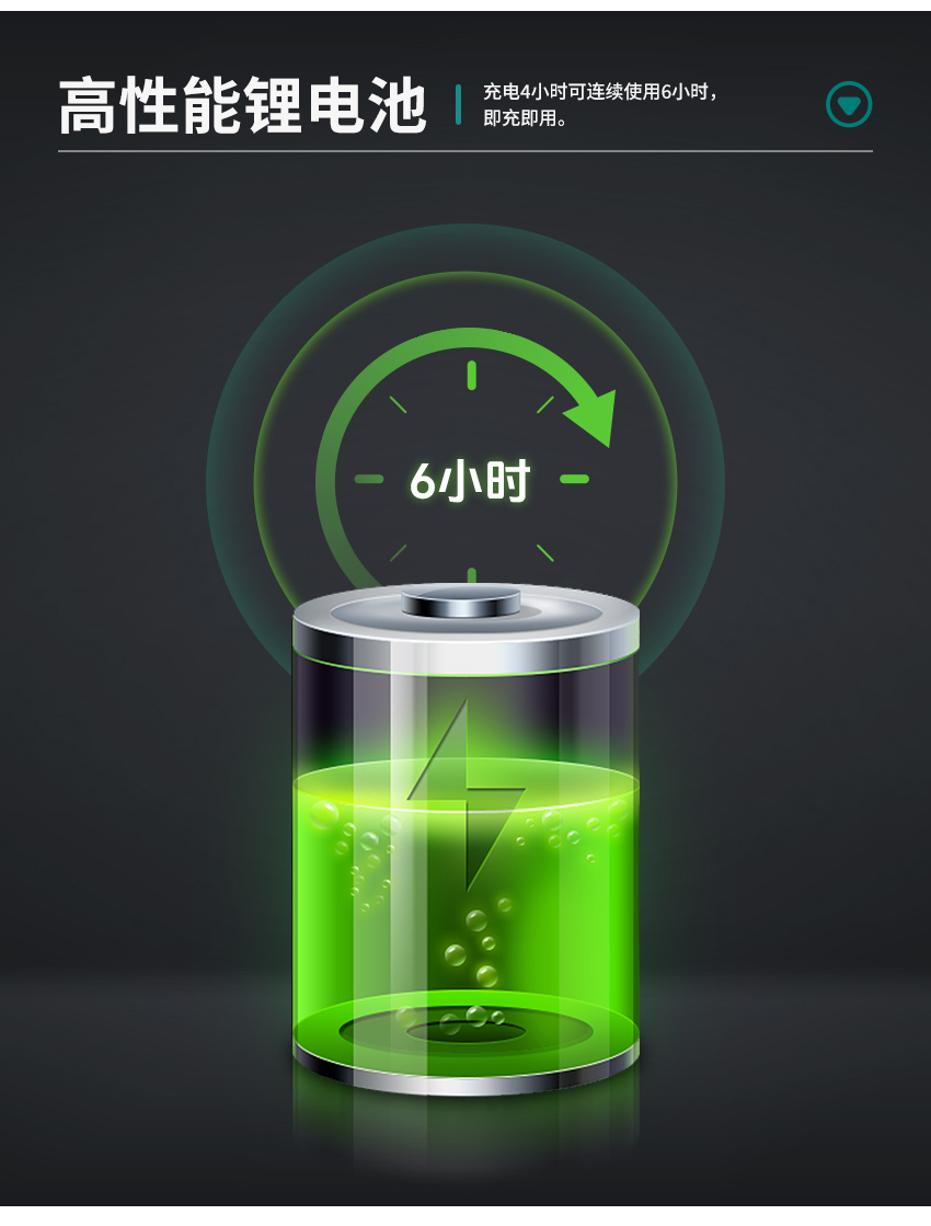 3.高性能锂电池,充电4小时可连续使用6小时,即充即用。