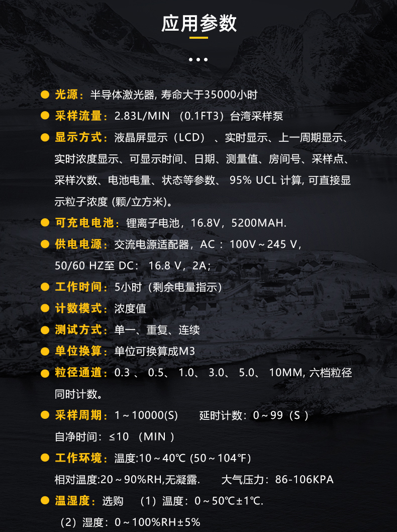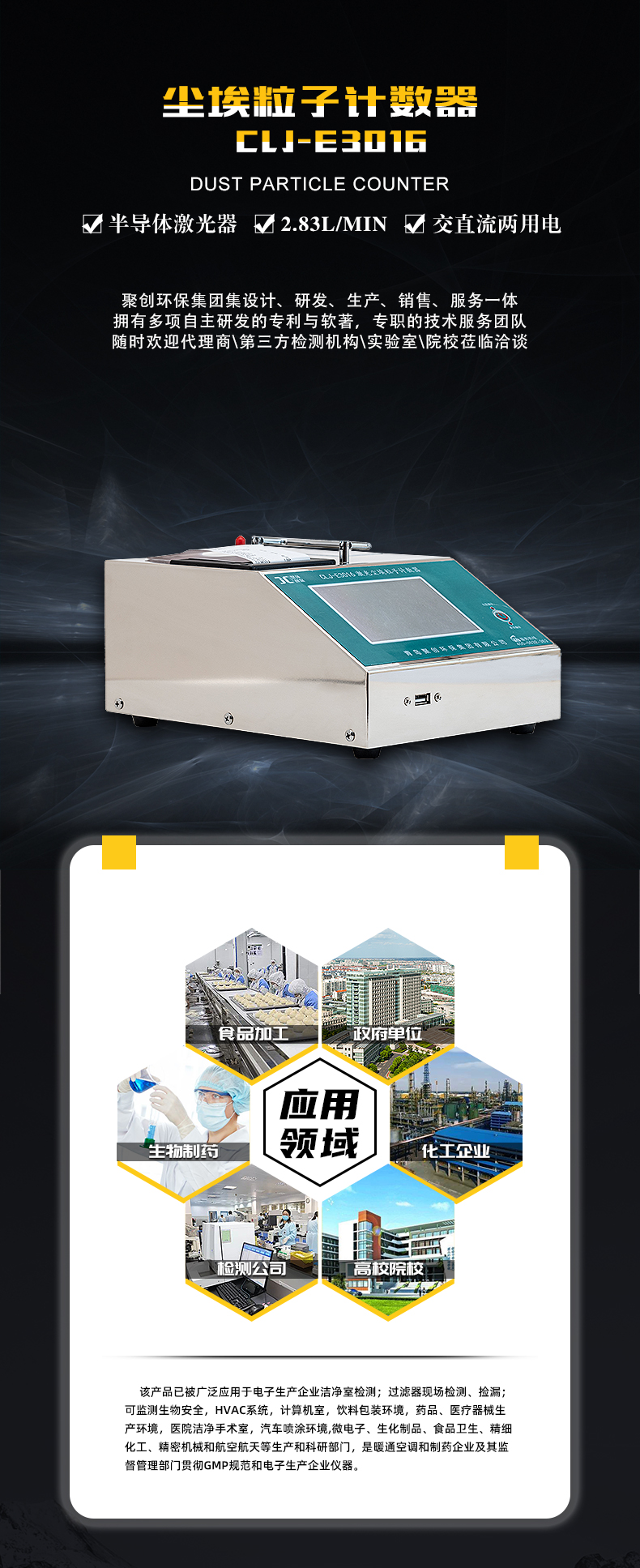 该仪器是公司新研制成功的采用全半体激光传感器的激光尘埃粒子计数器,技术指标均满足国家计量总局颁布的JJF1190-2008检定规程的要求,整机功能采用美国微电脑控制处理技术及半导体激光传感器技术及进口气泵,具有功能多、测量精度高、速度快、便于携带和操作简单等特点。仪器一次采样可同时测得多种粒径的尘埃粒子数,该产品已被广泛应用于电子生产企业洁净室检测;过滤器现场检测、捡漏;可监测生物安全,HVAC系统,计算机室,饮料包装环境,汽车喷涂环境,微电子、生化制品、食品卫生、精细化工、精密机械和航空航天等生产和科研部门,是暖通空调企业及其监督管理部门贯彻GMP规范和电子生产企业仪器。