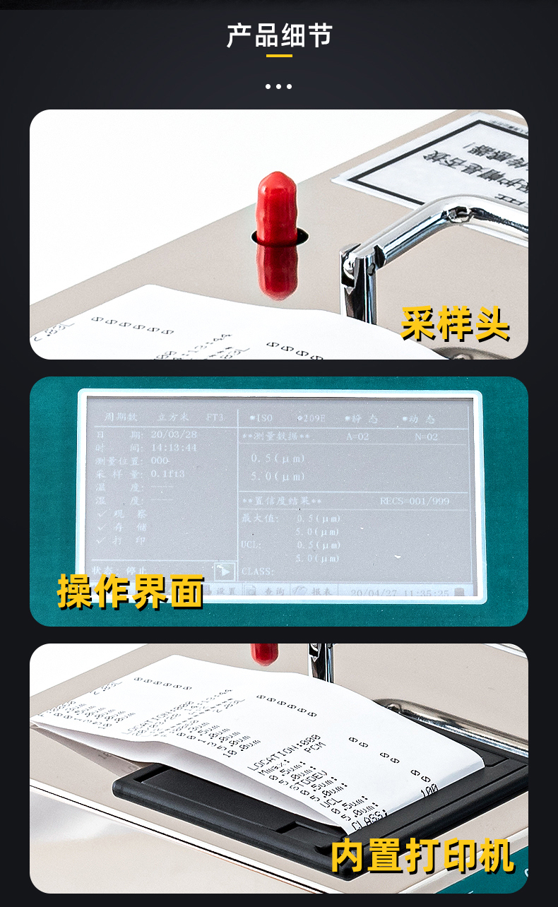 液晶屏显示(LCD) 、实时显示、上一周期显示、实时浓度显示、可显示时间、日期、测量值、房间号、采样点、采样次数、电池电量、状态等参数、 95% UCL 计算, 可直接显示粒子浓度 (颗/立方米)