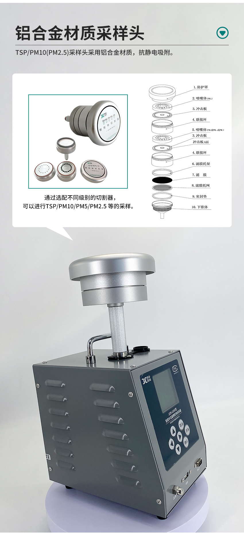 2、TSP/PM10(PM2、5)采样头采用铝合金材质,抗静电吸附。